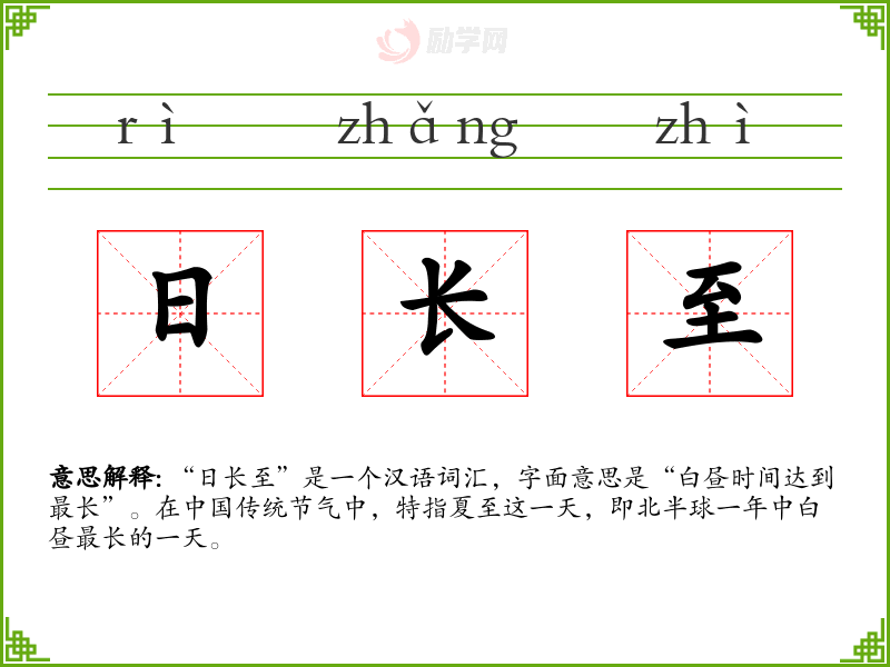 “日长至”是一个汉语词汇,字面意思是“白昼时间达到最长”。在**传统节气中,特指夏至这一天,即北半球一年中白昼最长的一天。