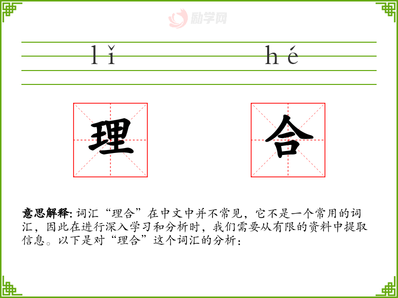 词汇“理合”在中文中并不常见,它不是一个常用的词汇,因此在进行深入学习和分析时,我们需要从有限的资料中提取信息。以下是对“理合”这个词汇的分析: