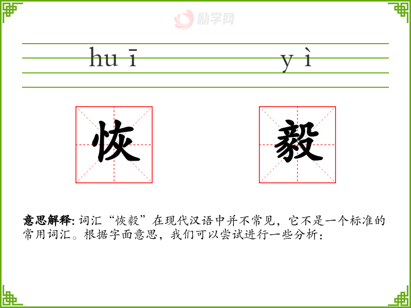 词汇“恢毅”在现代汉语中并不常见,它不是一个标准的常用词汇。根据字面意思,我们可以尝试进行一些分析: