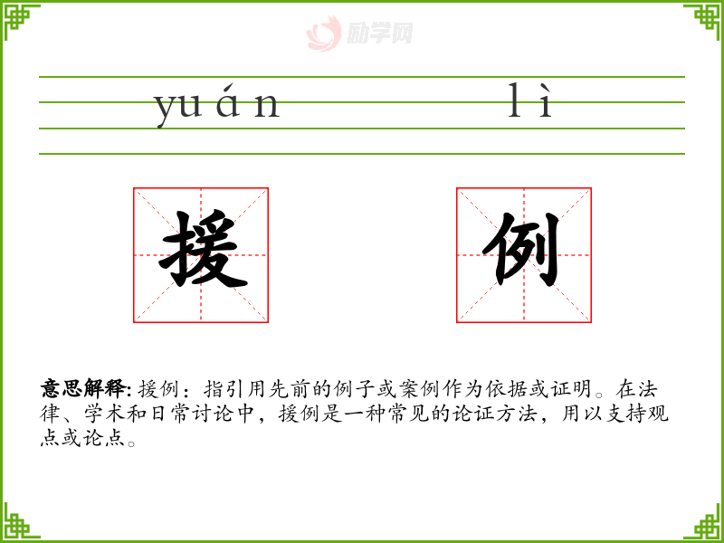 援例:指引用先前的例子或案例作为依据或证明。在法律、学术和日常讨论中,援例是一种常见的论证方法,用以支持观点或论点。