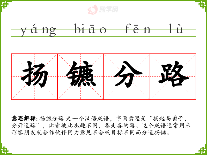 1.扬镳分路的拼音是什么?扬镳分路怎么读?