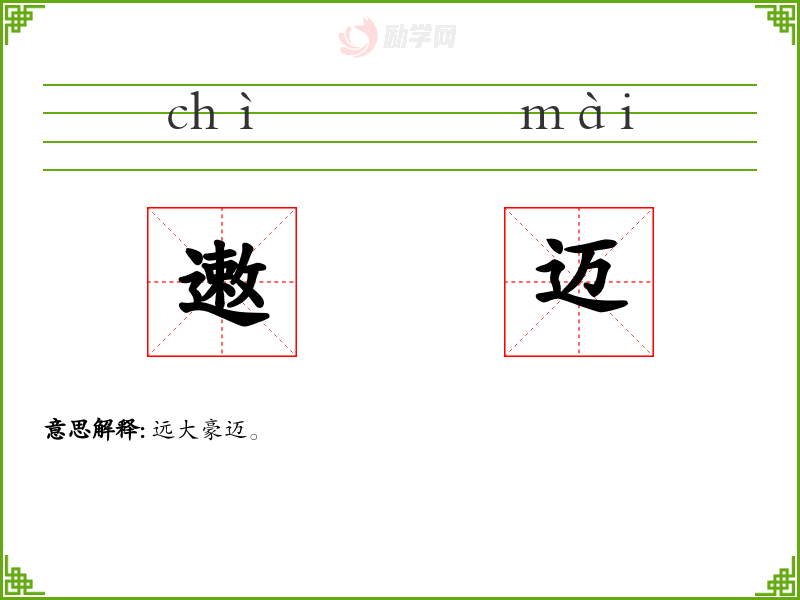 迈[ mài ] 1. (形声。从辵 夲义:远行)。 2. 同本义。 【引证】 钱谦益《徐霞客传》-丙子九月,辞家西迈。 《诗·小雅·小宛》-我日斯迈,而月斯征。 [更多解释]