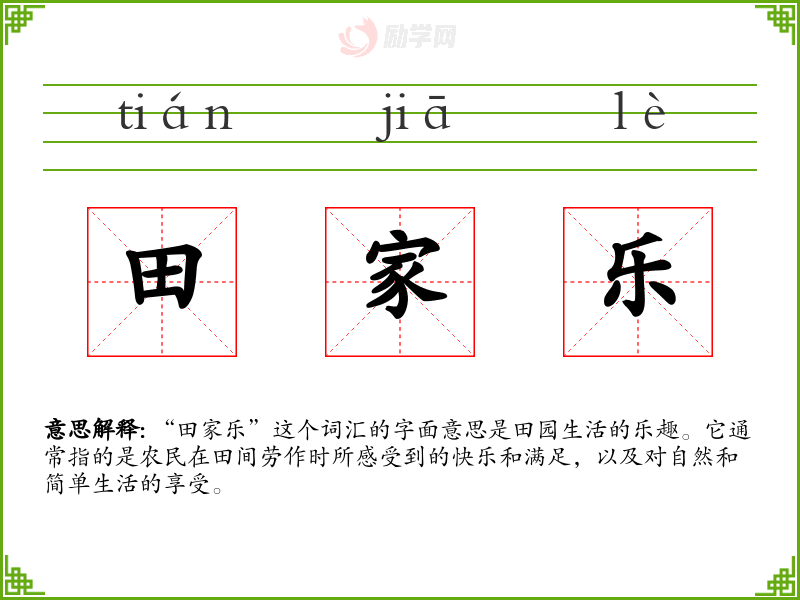 “田家乐”这个词汇的字面意思是田园生活的乐趣。它通常指的是农民在田间劳作时所感受到的快乐和满足,以及对自然和简单生活的享受。