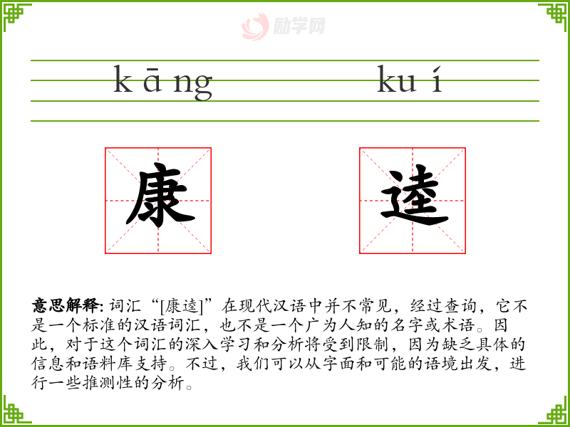 词汇“[康逵]”在现代汉语中并不常见,经过查询,它不是一个标准的汉语词汇,也不是一个广为人知的名字或术语。因此,对于这个词汇的深入学习和分析将受到限制,因为缺乏具体的信息和语料库支持。不过,我们可以从字面和可能的语境出发,进行一些推测性的分析。