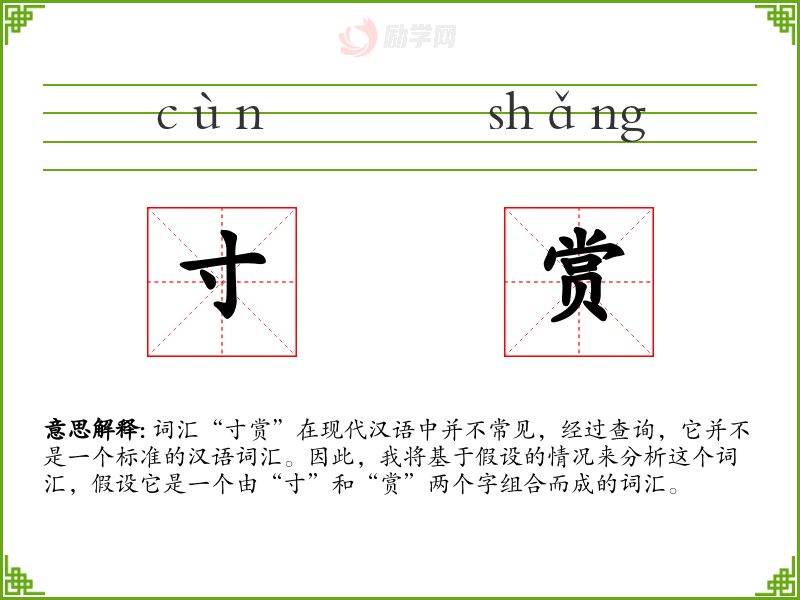 词汇“寸赏”在现代汉语中并不常见,经过查询,它并不是一个标准的汉语词汇。因此,我将基于假设的情况来分析这个词汇,假设它是一个由“寸”和“赏”两个字组合而成的词汇。