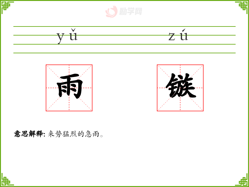 雨[ yǔ,yù ] 1. (象形。甲骨文字形,象下雨形。“雨”是汉字的一个部首,从“雨”的字都与“雨水”有关。本义:下雨)。 2. 同本义。 【引证】 《说文》-雨,水从云下也。 《易·小畜卦》-密云不雨。 [更多解释]