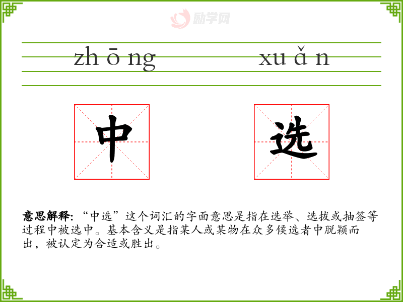 中选的拼音是:zhōng xuǎn