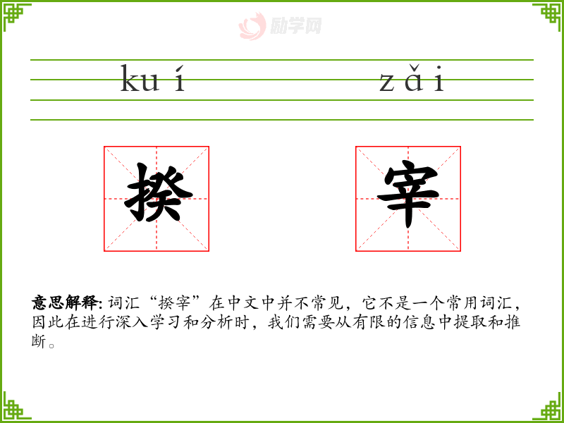 词汇“揆宰”在中文中并不常见,它不是一个常用词汇,因此在进行深入学*和分析时,我们需要从有限的信息中提取和推断。