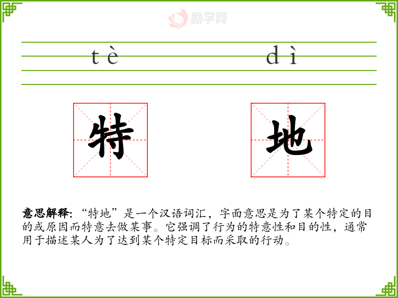 “特地”是一个汉语词汇,字面意思是为了某个特定的目的或原因而特意去做某事。它强调了行为的特意性和目的性,通常用于描述某人为了达到某个特定目标而采取的行动。