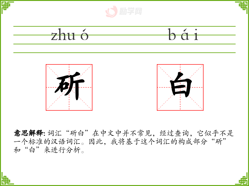 “斫白”作为一个非标准词汇,其含义和用法可能非常有限。在语言学习和表达中,它可能不是一个重要的词汇,但在特定的文学或艺术创作中,它可能被用来表达一种特殊的意境或理念。