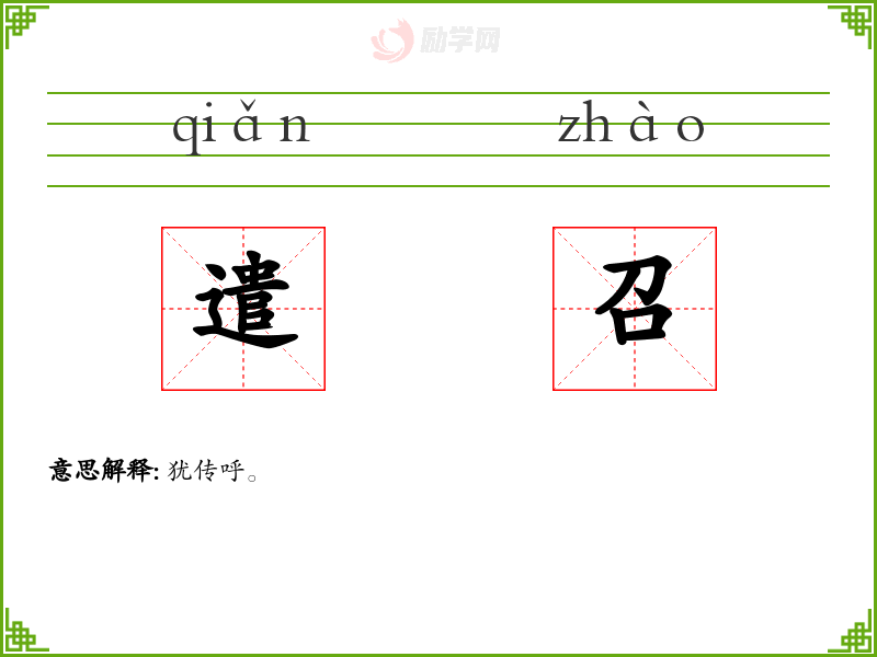 《说文》-召,呼也。从口,刀声。以言曰召,以手曰招。 《广雅·释诂二》-召,呼也。 《史记·廉颇蔺相如列传》-召有司。 唐·柳宗元《童区寄传》-大府召视儿。 宋·王谠《唐语林·雅量》-亦召供奉。