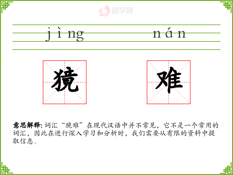 词汇“獍难”在现代汉语中并不常见,它不是一个常用的词汇,因此在进行深入学*和分析时,我们需要从有限的资料中提取信息。