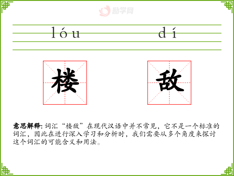 词汇“楼敌”在现代汉语中并不常见,它不是一个标准的词汇,因此在进行深入学习和分析时,我们需要从多个角度来探讨这个词汇的可能含义和用法。