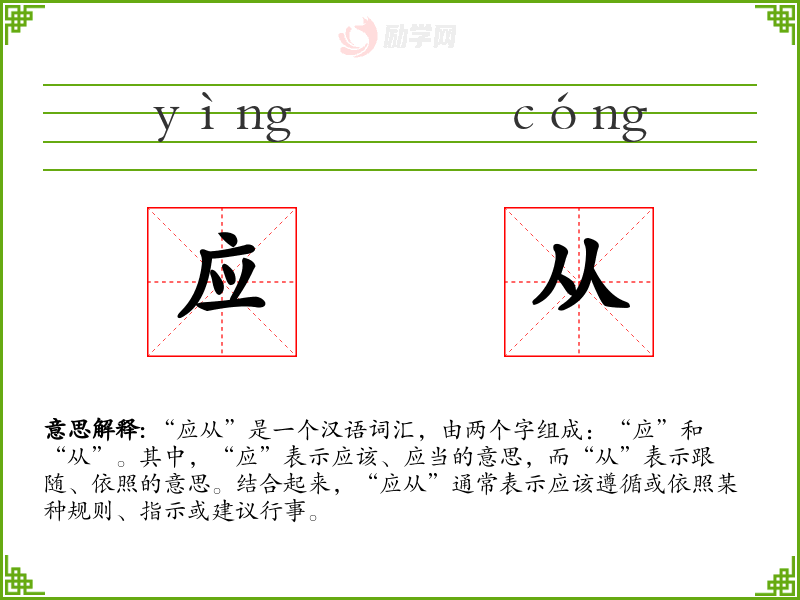 - 专业领域:在法律、教育等专业领域,“应从”可能用于规定行为标准或操作流程,例如:“学生应从学校的规定,按时完成作业。”