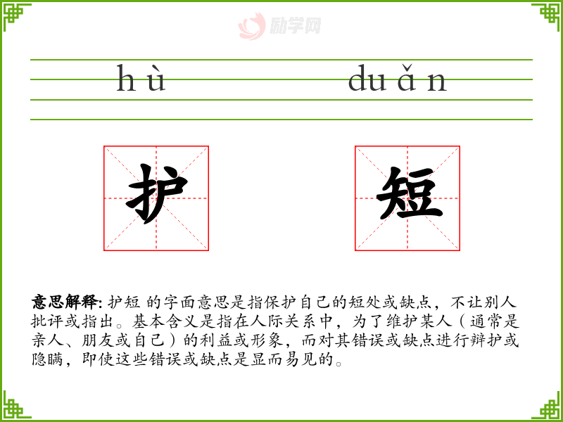 - 专业领域:在教育或管理领域,护短可能指的是教师或管理者对学生的错误行为视而不见,以维护自己的形象或避免麻烦。