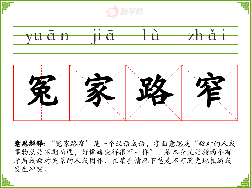 - 口语:在日常口语中,人们常用这个成语来形容不愉快的重逢或意料之外的冲突,如“真是冤家路窄,又遇到他了”。