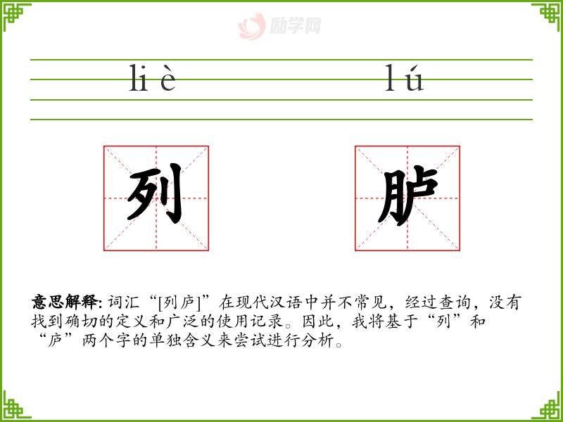 词汇“[列庐]”在现代汉语中并不常见,经过查询,没有找到确切的定义和广泛的使用记录。因此,我将基于“列”和“庐”两个字的单独含义来尝试进行分析。