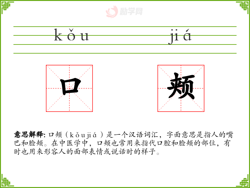 口颊(kǒu jiá)是一个汉语词汇,字面意思是指人的嘴巴和脸颊。在中医学中,口颊也常用来指代口腔和脸颊的部位,有时也用来形容人的面部表情或说话时的样子。
