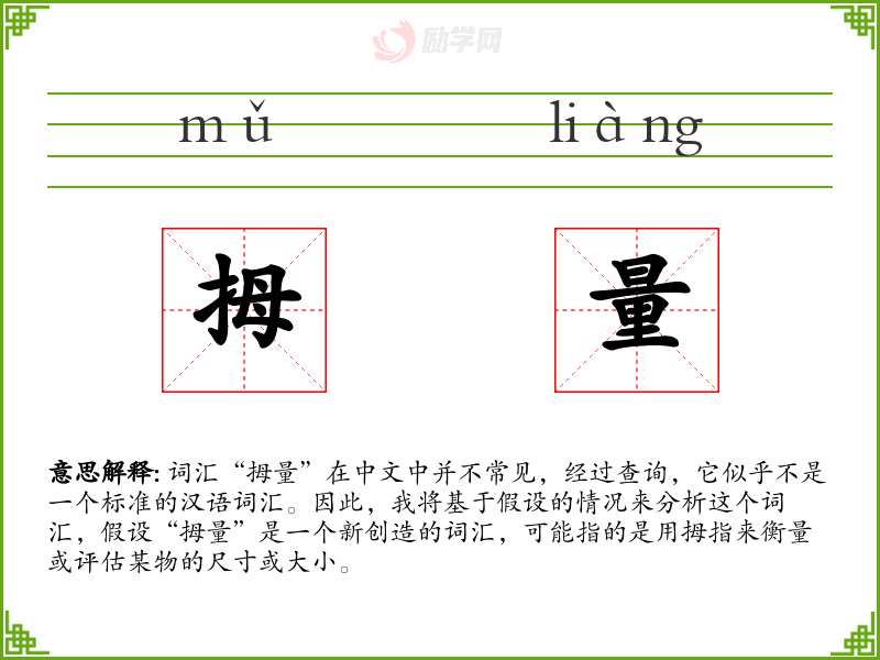 词汇“拇量”在中文中并不常见,经过查询,它似乎不是一个标准的汉语词汇。因此,我将基于假设的情况来分析这个词汇,假设“拇量”是一个新创造的词汇,可能指的是用拇指来衡量或评估某物的尺寸或大小。