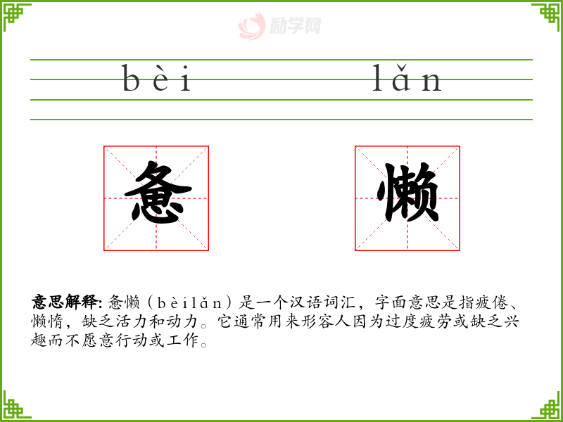 惫懒(bèi lǎn)是一个汉语词汇,字面意思是指疲倦、懒惰,缺乏活力和动力。它通常用来形容人因为过度疲劳或缺乏兴趣而不愿意行动或工作。