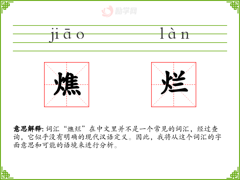 词汇“燋烂”在中文里并不是一个常见的词汇,经过查询,它似乎没有明确的现代汉语定义。因此,我将从这个词汇的字面意思和可能的语境来进行分析。