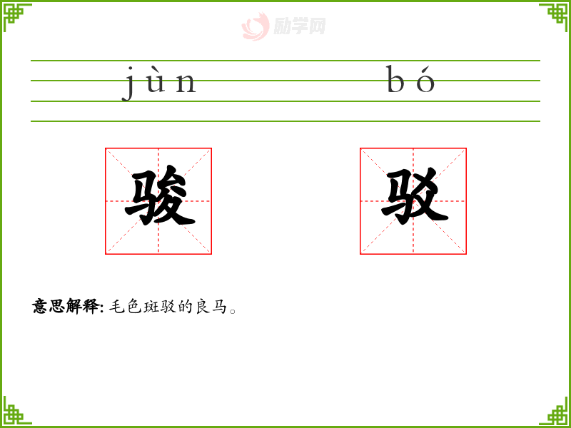 《说文》-骏,马之良材也。 《穆天子传》-天子八骏。 《乐府诗集·木兰诗》-东市买骏马。 《淮南子·人间训》-将胡骏马而归。