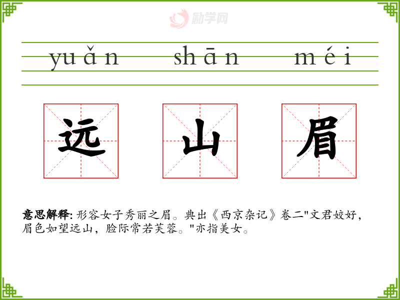 远山眉的意思是:形容女子秀丽之眉。典出《西京杂记》卷二"文君姣好,眉色如望远山,脸际常若芙蓉。"亦指美女。
