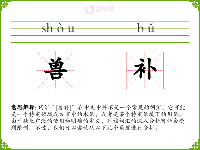 总的来说,由于“[兽补]”不是一个标准词汇,对其进行深入分析存在很大的困难。如果能够获得更多关于该词汇的背景信息和具体使用情况,我们或许能够提供更详细的分析。