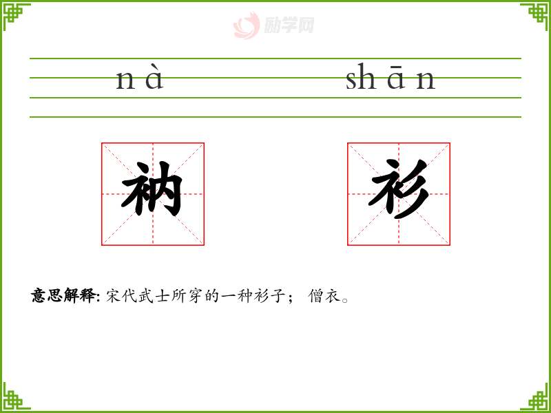 衲衫的意思是:宋代武士所穿的一种衫子; 僧衣。