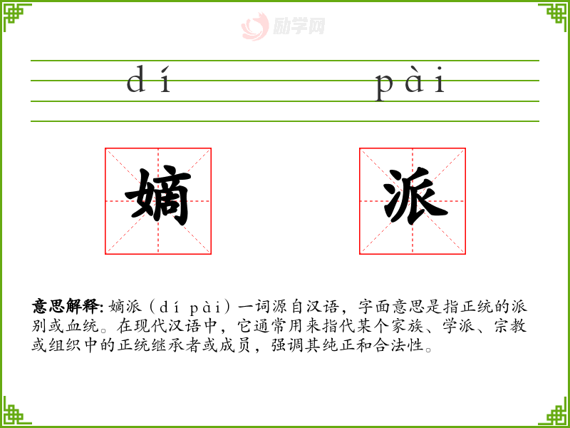 - 文学:在文学作品中,“嫡派”常用来描述某个家族或学派的正统继承人,如“他是这个武术世家的嫡派传人”。