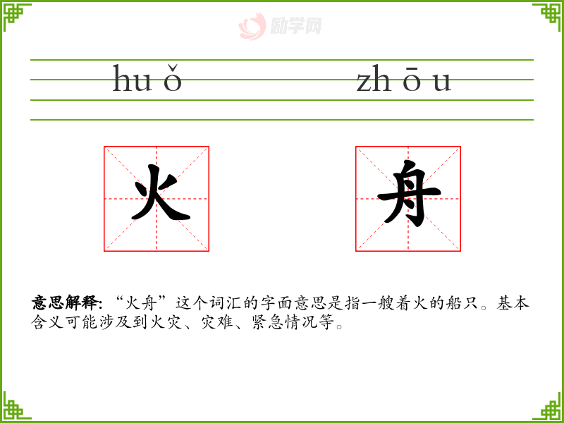 “火舟”这个词汇的字面意思是指一艘着火的船只。基本含义可能涉及到火灾、灾难、紧急情况等。