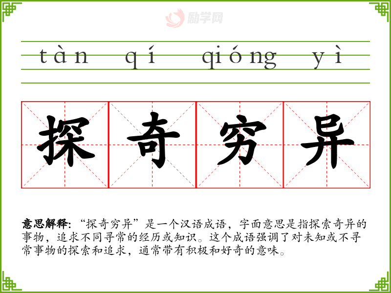 “探奇穷异”这个词汇在我语言学和表达中具有重要意义。它不仅代表了探索和好奇的精神,也鼓励我在生活中不断追求新知识和经历。通过深入学和分析这个词汇,我更加理解了它在不同语境中的应用和价值。