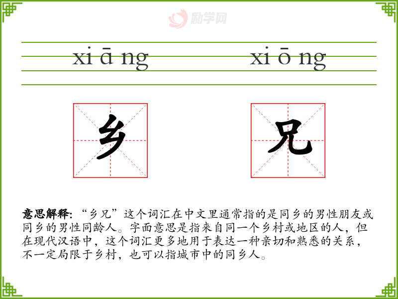 “乡兄”这个词汇在中文里通常指的是同乡的男性朋友或同乡的男性同龄人。字面意思是指来自同一个乡村或地区的人,但在现代汉语中,这个词汇更多地用于表达一种亲切和熟悉的关系,不一定局限于乡村,也可以指城市中的同乡人。