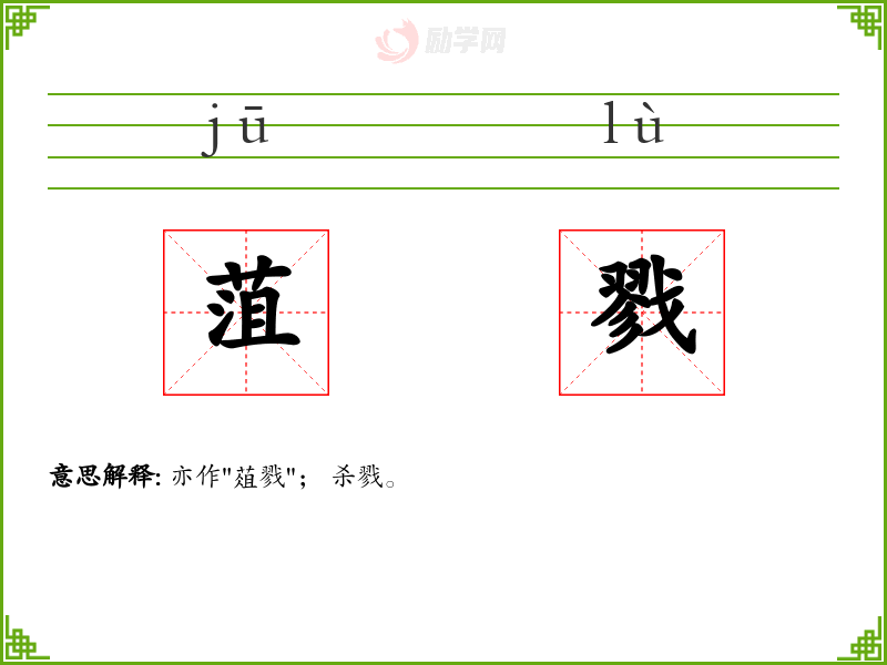 《说文》-戮,杀也。字亦作剹。 《周礼·掌戮》注-戮谓膊焚辜肆。 《荀子·王制》-防淫除邪,戮之以五刑。 《资治通鉴》-俘囚为盗耳,晓当尽戮之。