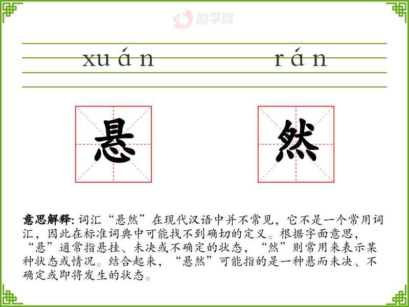 由于“悬然”不是一个常用词汇,其词源和演变可能不为人所熟知。它可能是由“悬”和“然”两个字组合而成,用以描述一种特定的状态。