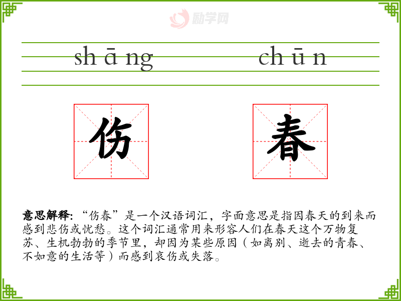 “伤春”是一个汉语词汇,字面意思是指因春天的到来而感到悲伤或忧愁。这个词汇通常用来形容人们在春天这个万物复苏、生机勃勃的季节里,却因为某些原因(如离别、逝去的青春、不如意的生活等)而感到哀伤或失落。