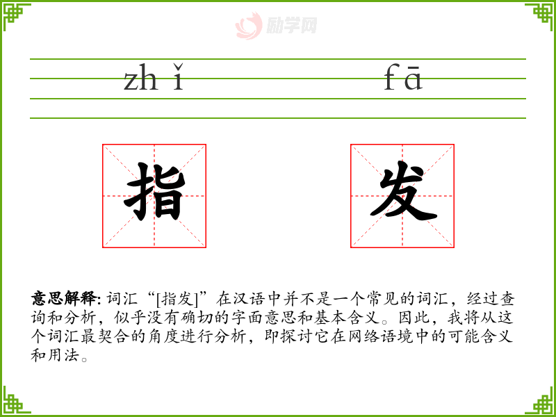词汇“[指发]”在汉语中并不是一个常见的词汇,经过查询和分析,似乎没有确切的字面意思和基本含义。因此,我将从这个词汇最契合的角度进行分析,即探讨它在网络语境中的可能含义和用法。