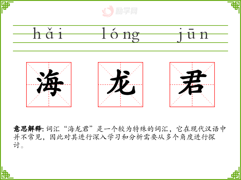 词汇“海龙君”是一个较为特殊的词汇,它在现代汉语中并不常见,因此对其进行深入学*和分析需要从多个角度进行探讨。