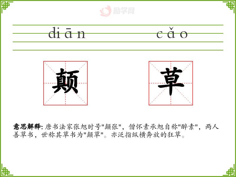 颠草的意思是:唐书法家张旭时号"颠张",僧怀素承旭自称"醉素",两人善草书,世称其草书为"颠草"。亦泛指纵横奔放的狂草。