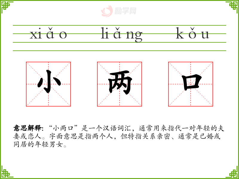 “小两口”这个词不仅描述了一对年轻夫妻,还蕴含了对他们未来生活的美好祝愿。在语言学*和表达中,了解和使用这样的词汇可以增加语言的丰富性和文化深度。