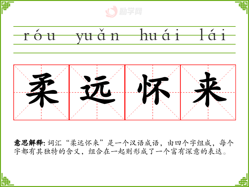 词汇“柔远怀来”是一个汉语成语,由四个字组成,每个字都有其独特的含义,组合在一起则形成了一个富有深意的表达。