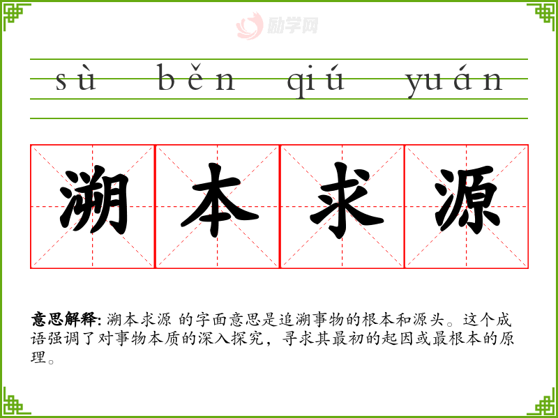 溯本求源 的字面意思是追溯事物的根本和源头。这个成语强调了对事物本质的深入探究,寻求其最初的起因或最根本的原理。