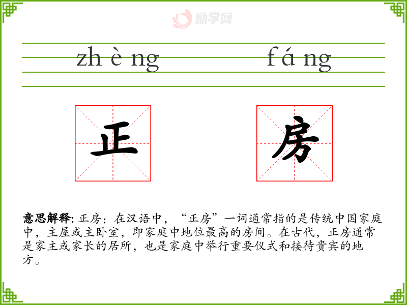 - 专业领域:在建筑学或历史学中,“正房”可能特指传统建筑中的主屋结构。