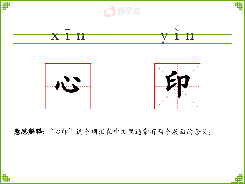 心印的意思是:佛教禅宗语。谓不用语言文字,而直接以心相印证,以期顿悟; 理学家借以指对圣人学说在心性上的领会; 泛指内心有所领会; 心心相印; 拆字术。