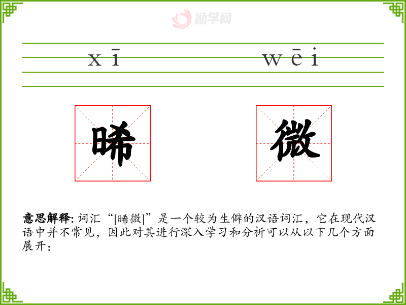 词汇“[晞微]”是一个较为生僻的汉语词汇,它在现代汉语中并不常见,因此对其进行深入学*和分析可以从以下几个方面展开: