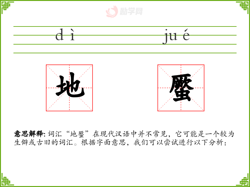 词汇“地蟨”在现代汉语中并不常见,它可能是一个较为生僻或古旧的词汇。根据字面意思,我们可以尝试进行以下分析: