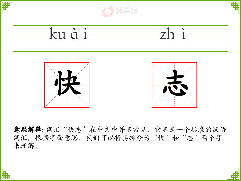 词汇“快志”在中文中并不常见,它不是一个标准的汉语词汇。根据字面意思,我们可以将其拆分为“快”和“志”两个字来理解。