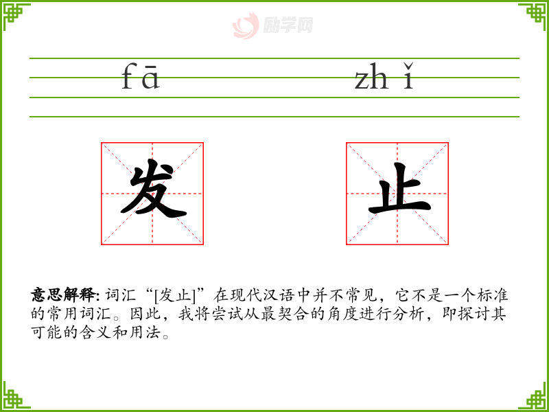 词汇“[发止]”在现代汉语中并不常见,它不是一个标准的常用词汇。因此,我将尝试从最契合的角度进行分析,即探讨其可能的含义和用法。
