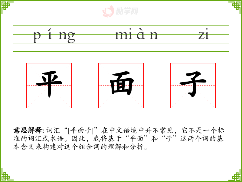尽管“平面子”不是一个常用词汇,通过对“平面”和“子”的基本含义的理解,我们可以构建对这个组合词的理解。在语言学习和表达中,理解词汇的基本含义和语境使用是非常重要的。通过这种方式,我们可以更好地掌握和运用语言。