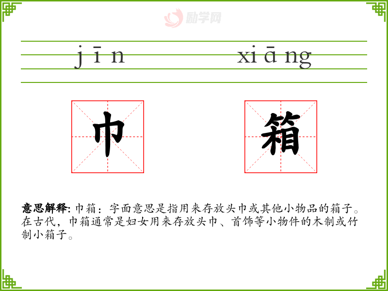 巾箱:字面意思是指用来存放头巾或其他小物品的箱子。在古代,巾箱通常是妇女用来存放头巾、首饰等小物件的木制或竹制小箱子。